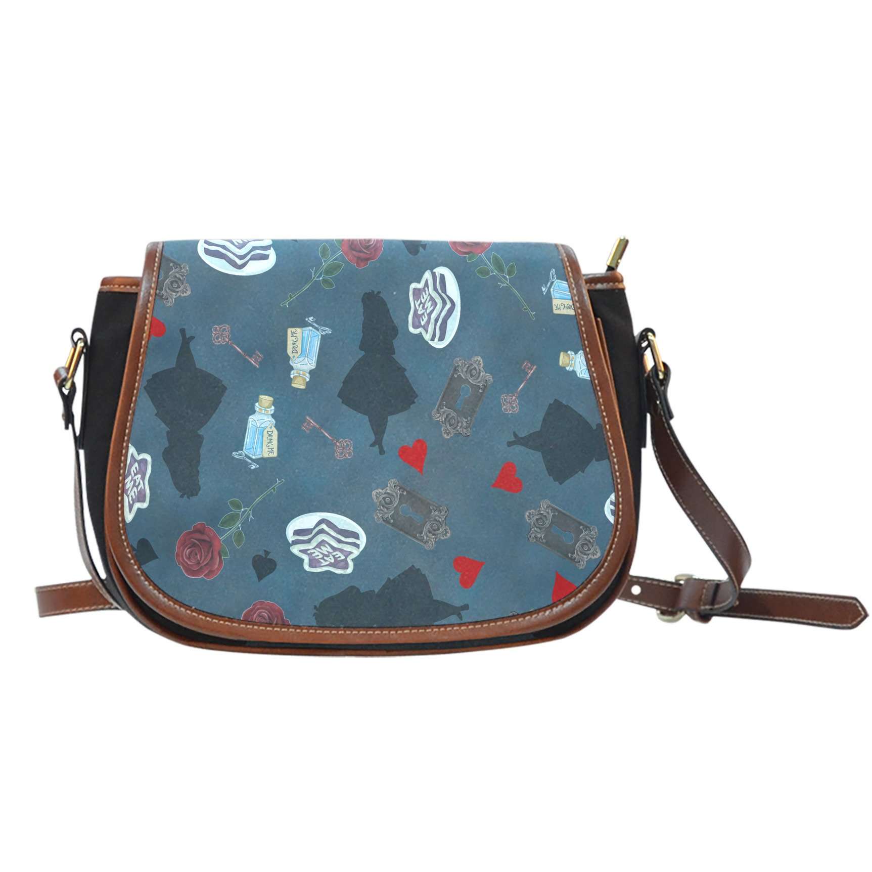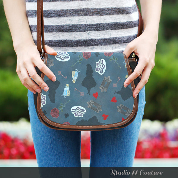 Alice In Wonderland Silhouette Drink Me Eat Me Red Roses Gold Keys Blue Crossbody Shoulder Canvas Leather Saddle Bag