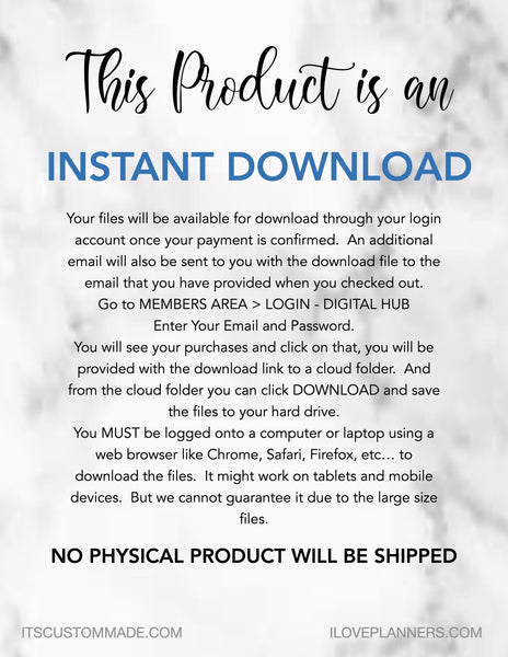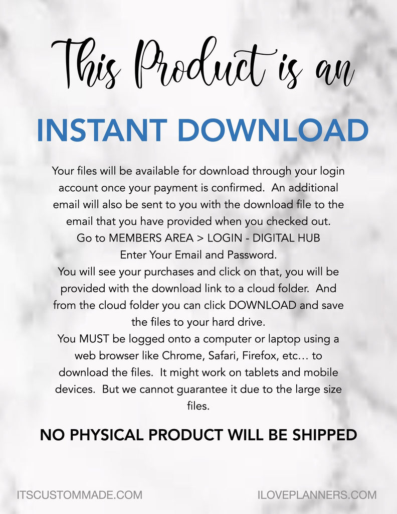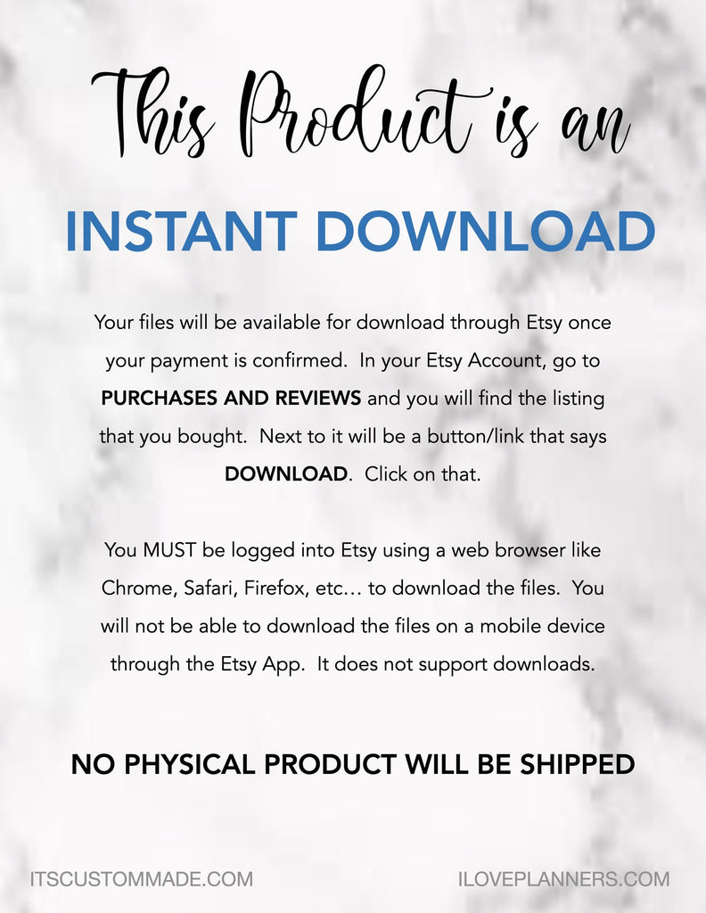 This is a DIGITAL DOWNLOAD. You will receive INSTANT DOWNLOAD. Nothing will be sent in the mail. Instant satisfaction. No need to wait for it to arrive in the mail. This is for the digital planner file only. This listing does not include any stylus pen, computer, ipad, tablet, phone, or any electronic devices. Anything shown in the listing is for demonstration purposes only.