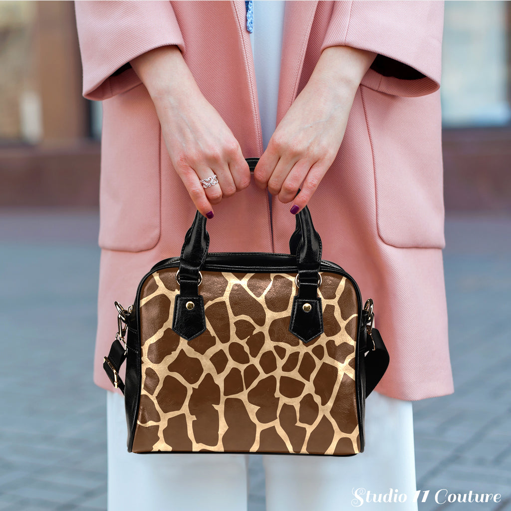 Animal Prints Giraffe Theme Women Fashion Shoulder Handbag Black Vegan Faux Leather