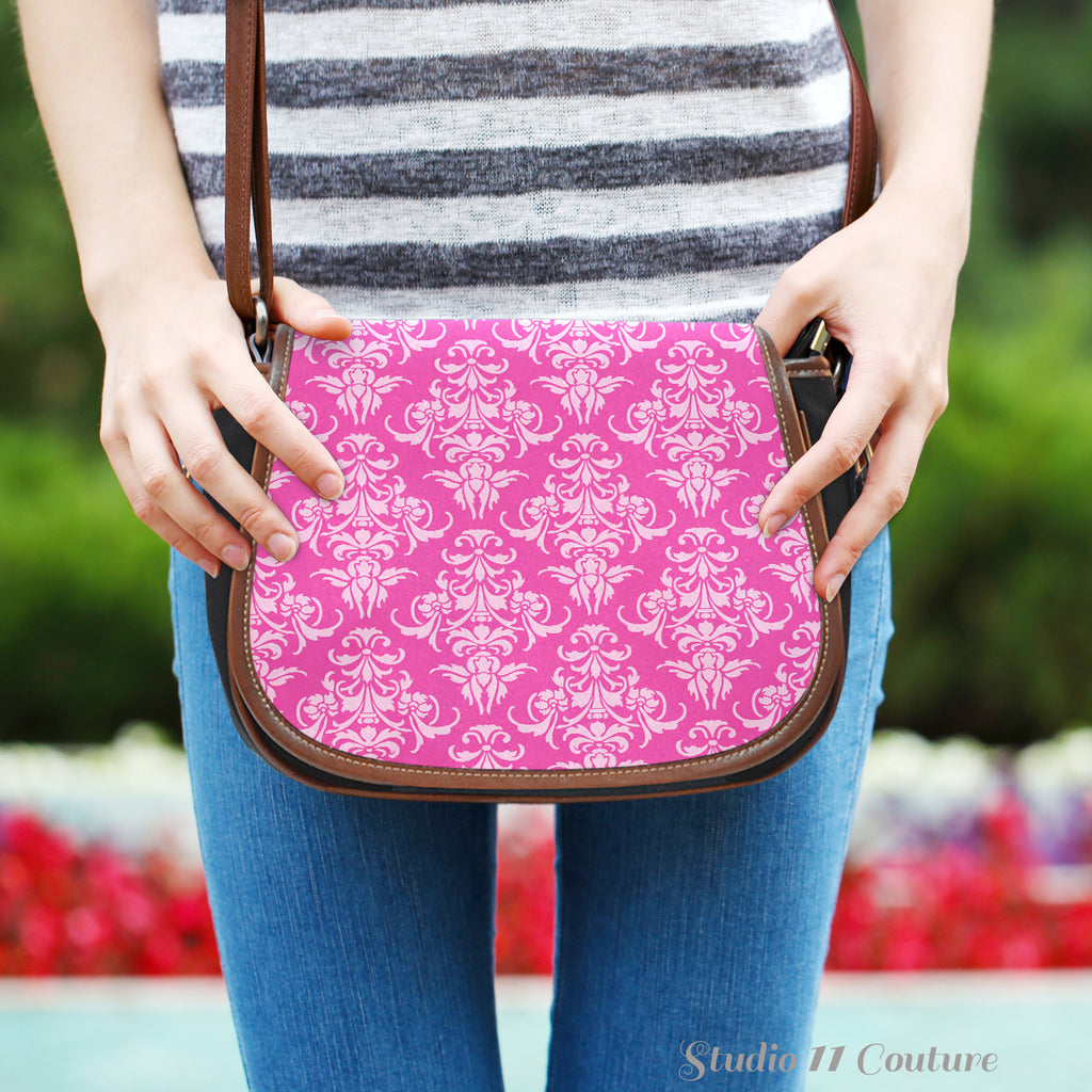 Curved detailing ornates the saddle-shaped flap of a lux crossbody bag crafted from luscious leather and canvas materials. This saddle bag has a flap over the zipper closure. The handbag has an adjustable leather strap with leather detailing. The body is a high-quality canvas material. The prints on the exterior is a contemporary spin on a vintage-inspired leather saddle bag. Great for traveling, date night, and for work. So versatile, you can wear this with any look.