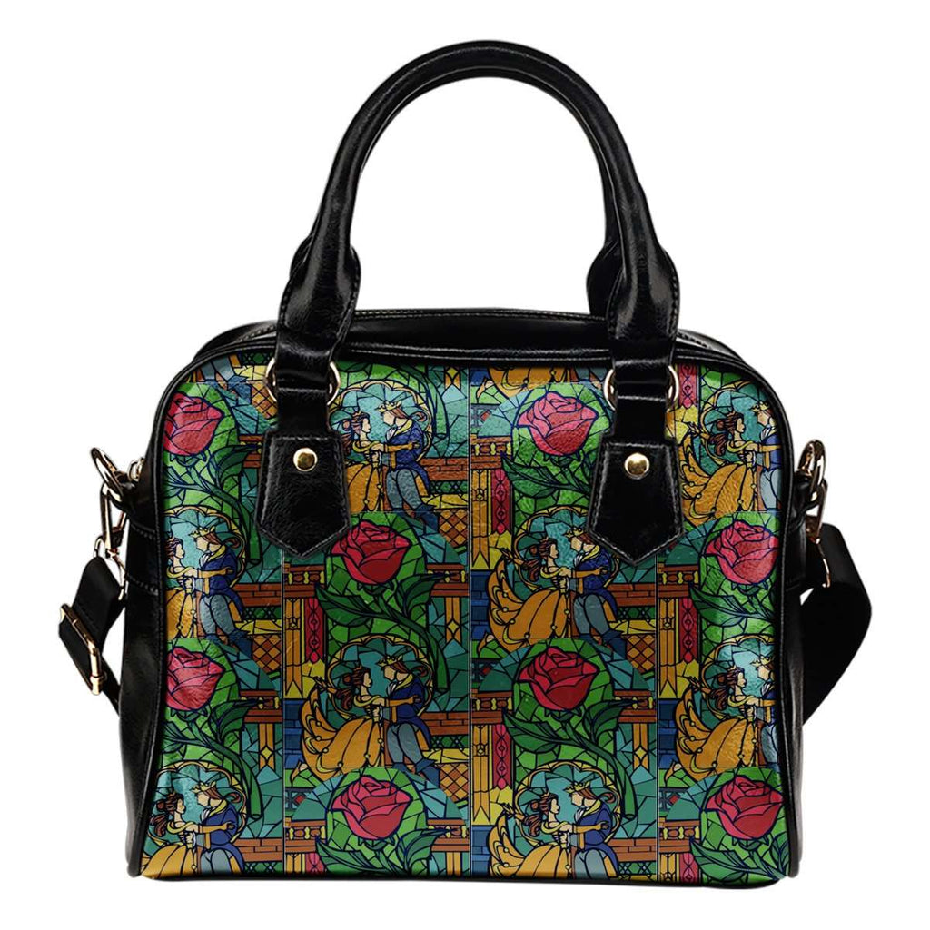 Beauty And The Beast Stained Glass Theme Women Fashion Shoulder Handbag Black Vegan Faux Leather