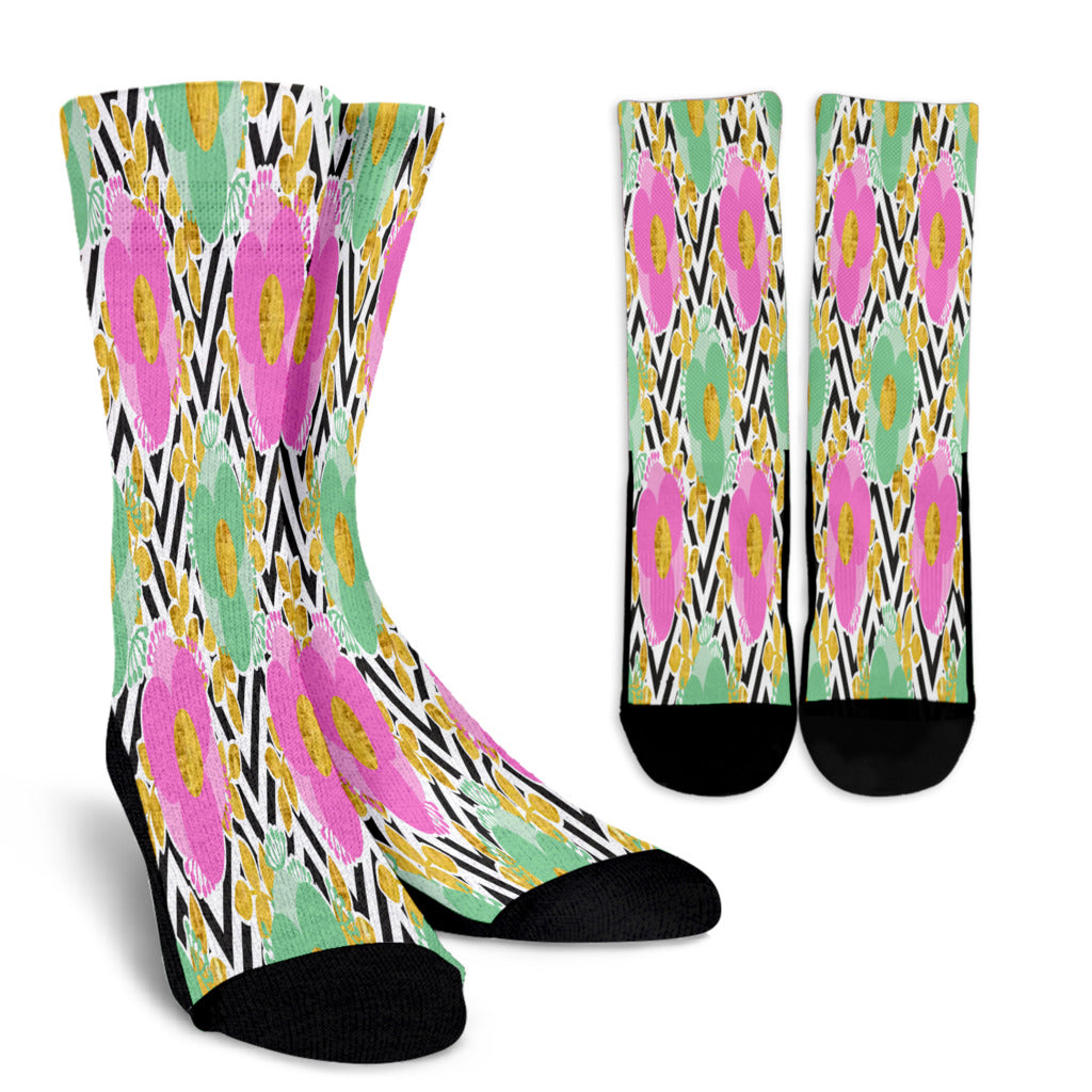 Black and White Zigzag Floral Spring Crew Socks