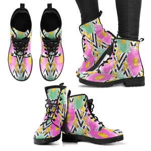 - Features eco-friendly leather with a double-sided print and rounded toe construction.