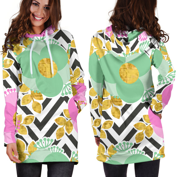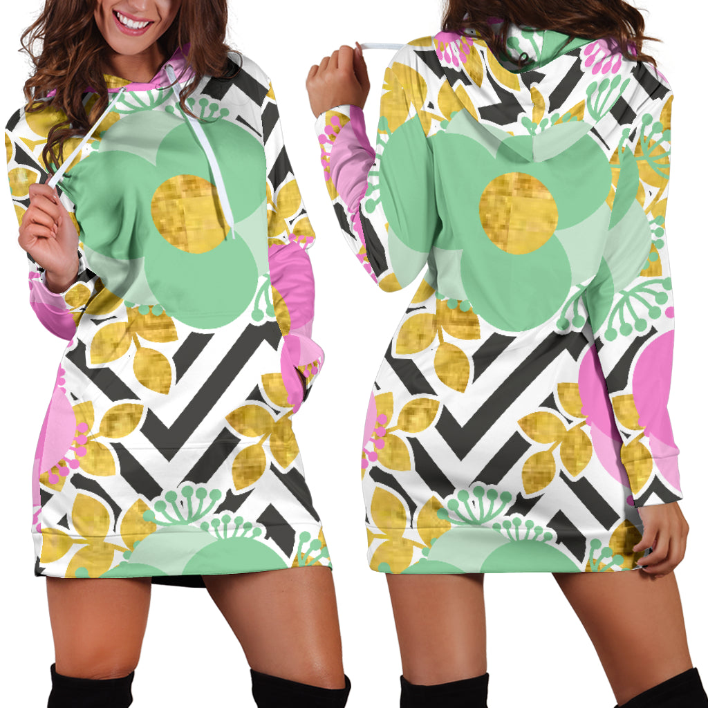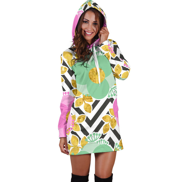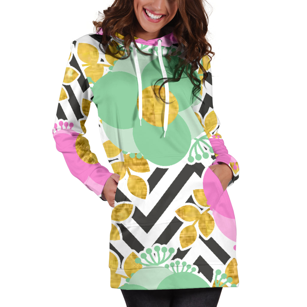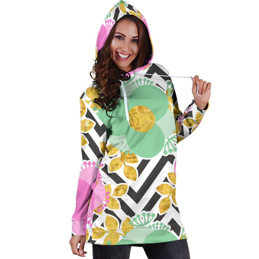 Studio11Couture Women Hoodie Dress Hooded Tunic Black and White Zigzag Floral Spring Athleisure Sweatshirt