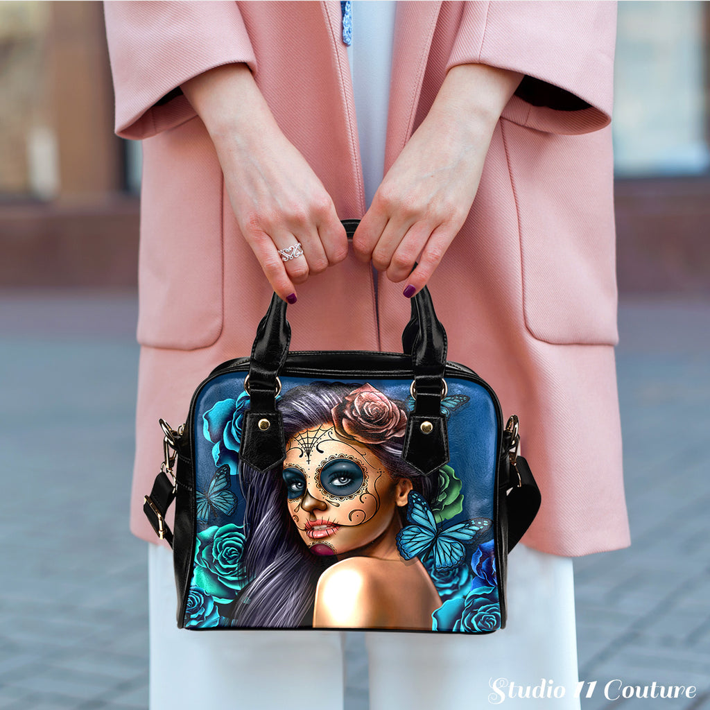 Blue Sugar Skull Girl Theme Women Fashion Shoulder Handbag Black Vegan Faux Leather