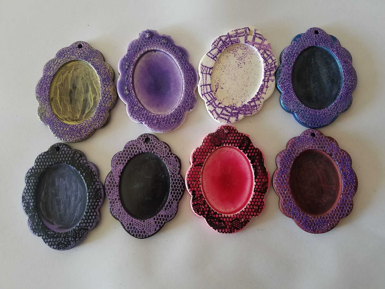 8 resin frames. One of a kind and handmade. Mix of different colors and patterns. Patterns are 3d printed on so it will have a raised pattern. All made in the USA with USA made materials. I am selling these for less than what it costs me to make them. I need to make room for new supplies. I originally made these to decorate jewelry, scrapbooking, and cell phones. But the uses is not limited to just those categories. You are only limited by your imagination. Will fit cameos and cabochons size 40x30mm oval. The distress look and texture was done on purpose. And these are a mix of A & B quality items. Most are in very good condition but I cannot guarantee that they are perfect. If you see what you like, buy them quick. Once this lot is gone, I will bot be relisting them. Because this is a clearance lot, all sales are final. No return and no exchange. You will receive exact lot items in the pictures. Colors may vary from computer monitors to computer monitors. And pictures are taken with a normal camera with no photoshopping effects.