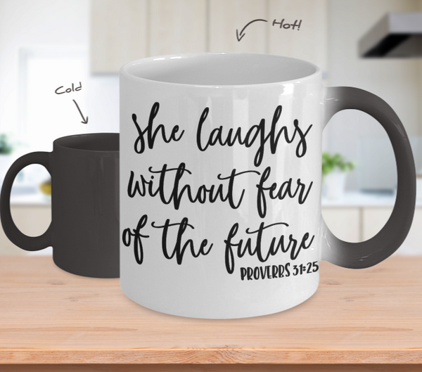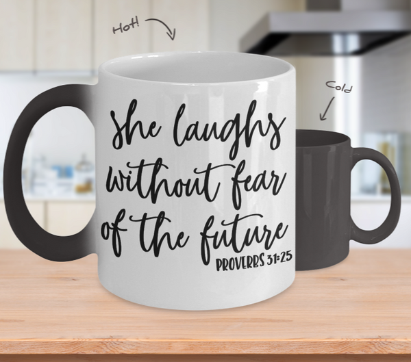 Color Changing Mug Christian Faith Entrepreneur Feminist Girl Boss She Laughs Without Fear Of The Future