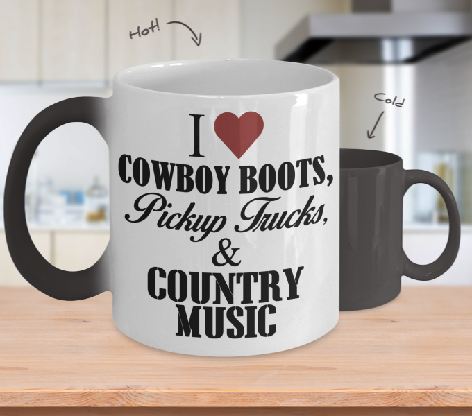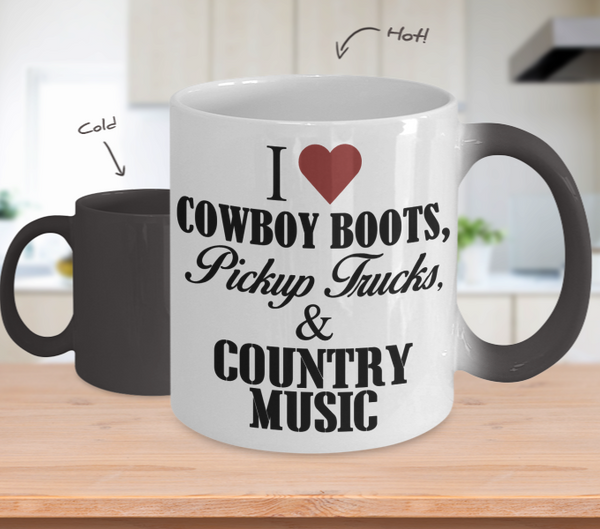 Color Changing Mug Music Theme I Love Cowboy Boots Pickup Trucks & Country