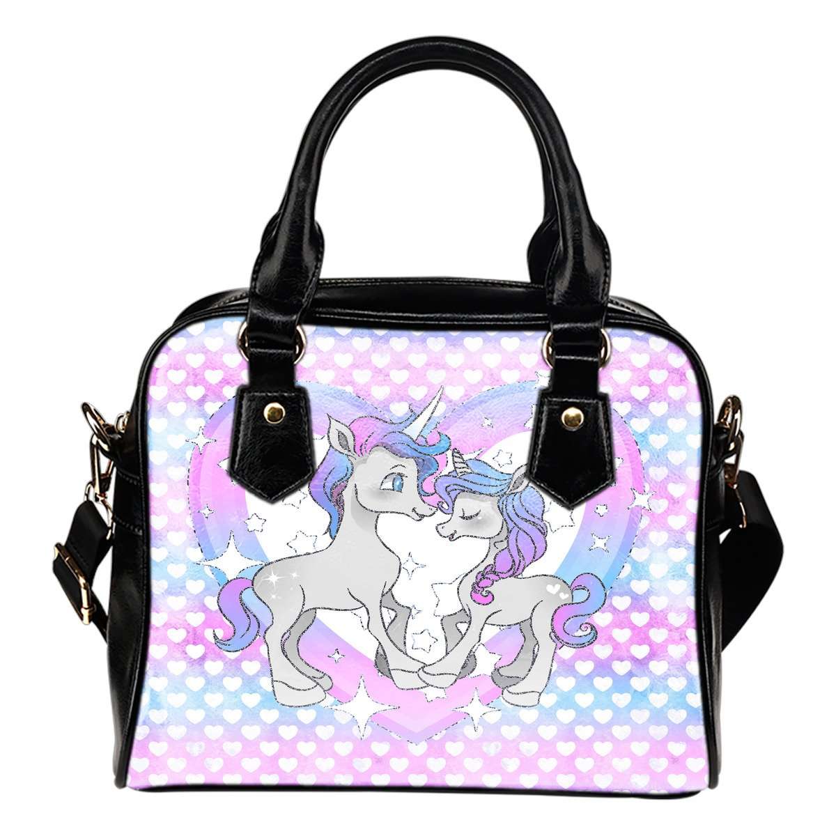 Unicorn Hombre Heart Theme Women Fashion Shoulder Handbag Black Vegan Faux Leather