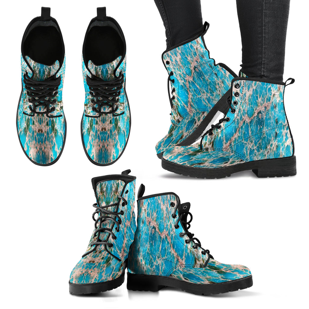 - Features eco-friendly leather with a double-sided print and rounded toe construction.