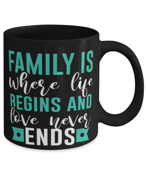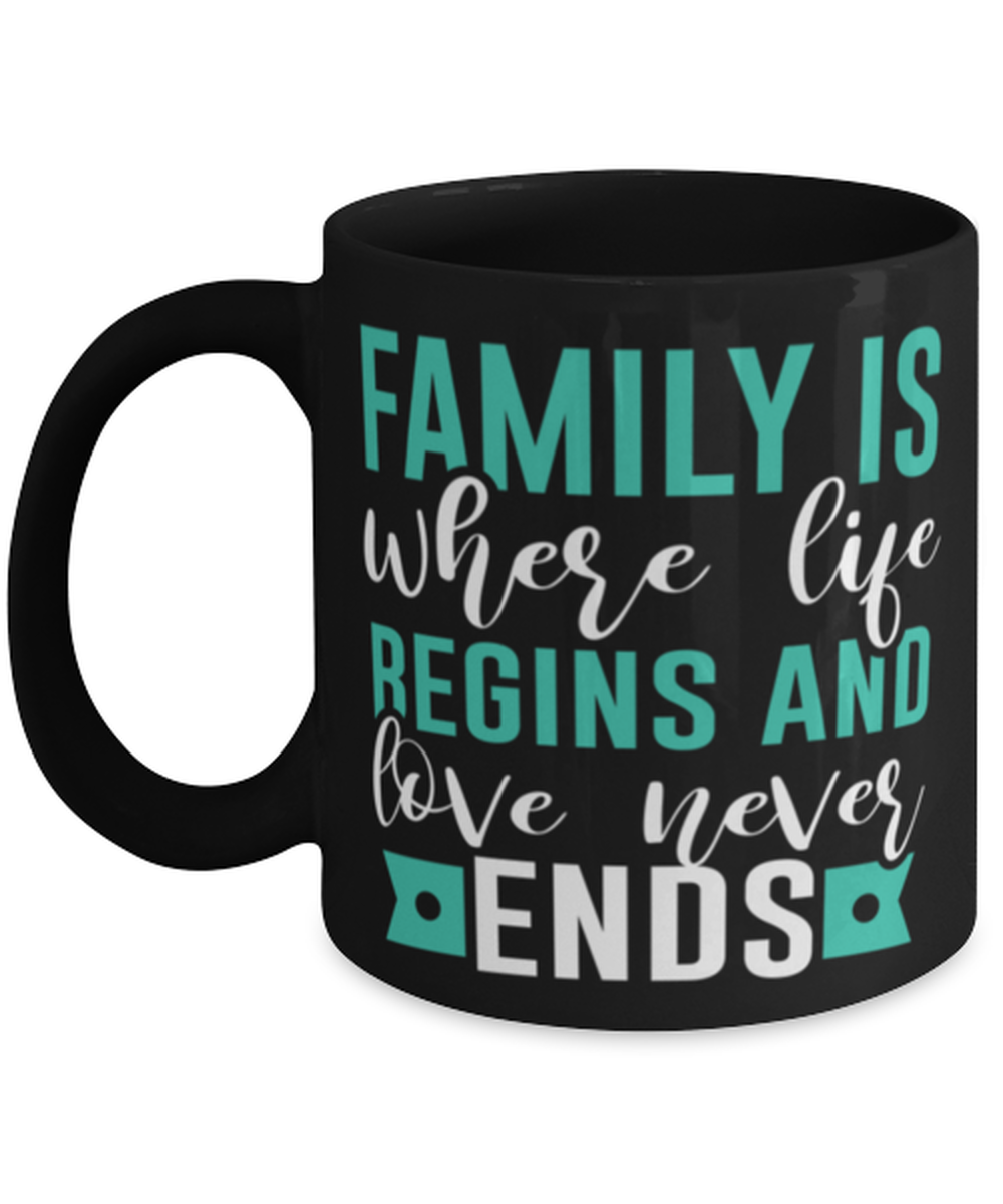 family is about where life begnis and love never ends, Coffee Mug