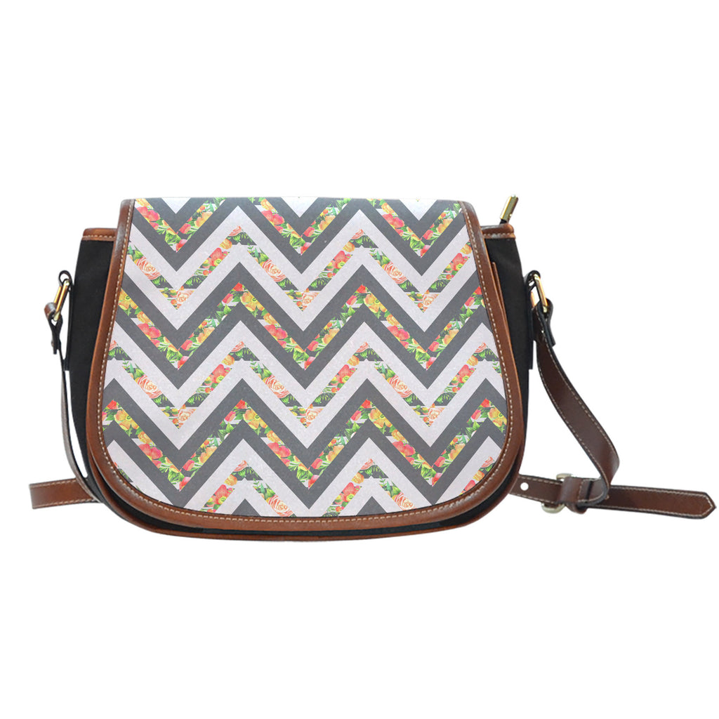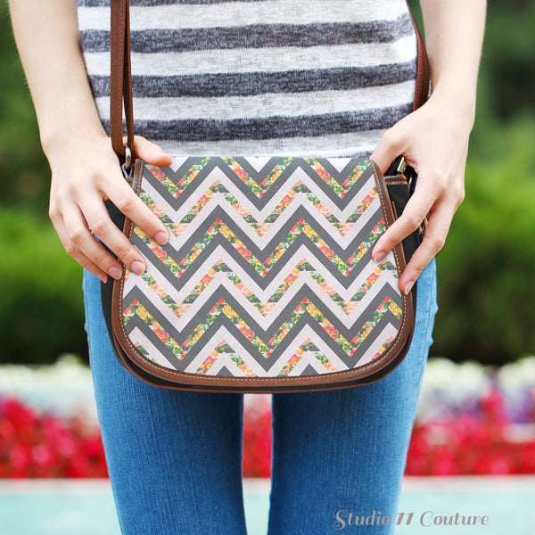 Curved detailing ornates the saddle-shaped flap of a lux crossbody bag crafted from luscious leather and canvas materials. This saddle bag has a flap over the zipper closure. The handbag has an adjustable leather strap with leather detailing. The body is a high-quality canvas material. The prints on the exterior is a contemporary spin on a vintage-inspired leather saddle bag. Great for traveling, date night, and for work. So versatile, you can wear this with any look.