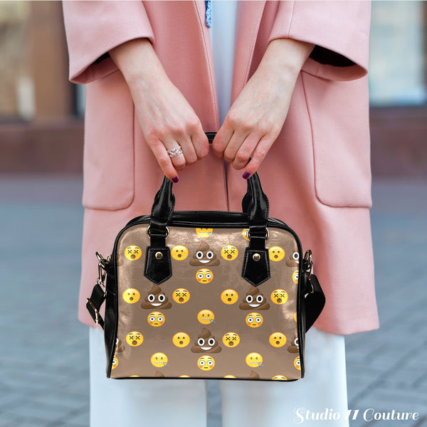 Fun Emojis Poo Theme Women Fashion Shoulder Handbag Black Vegan Faux Leather
