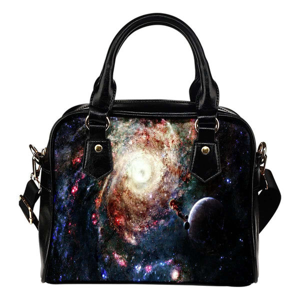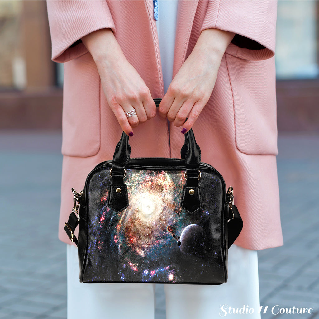 Galaxy #8 Theme Women Fashion Shoulder Handbag Black Vegan Faux Leather