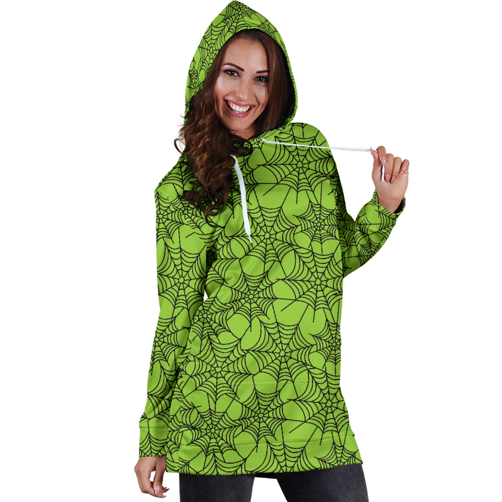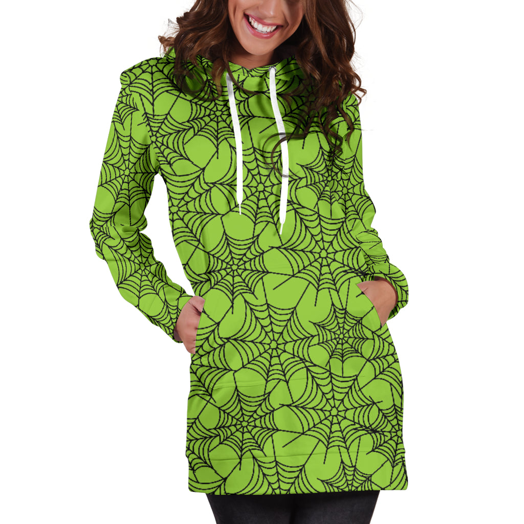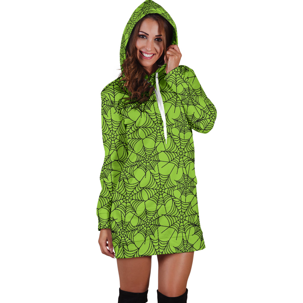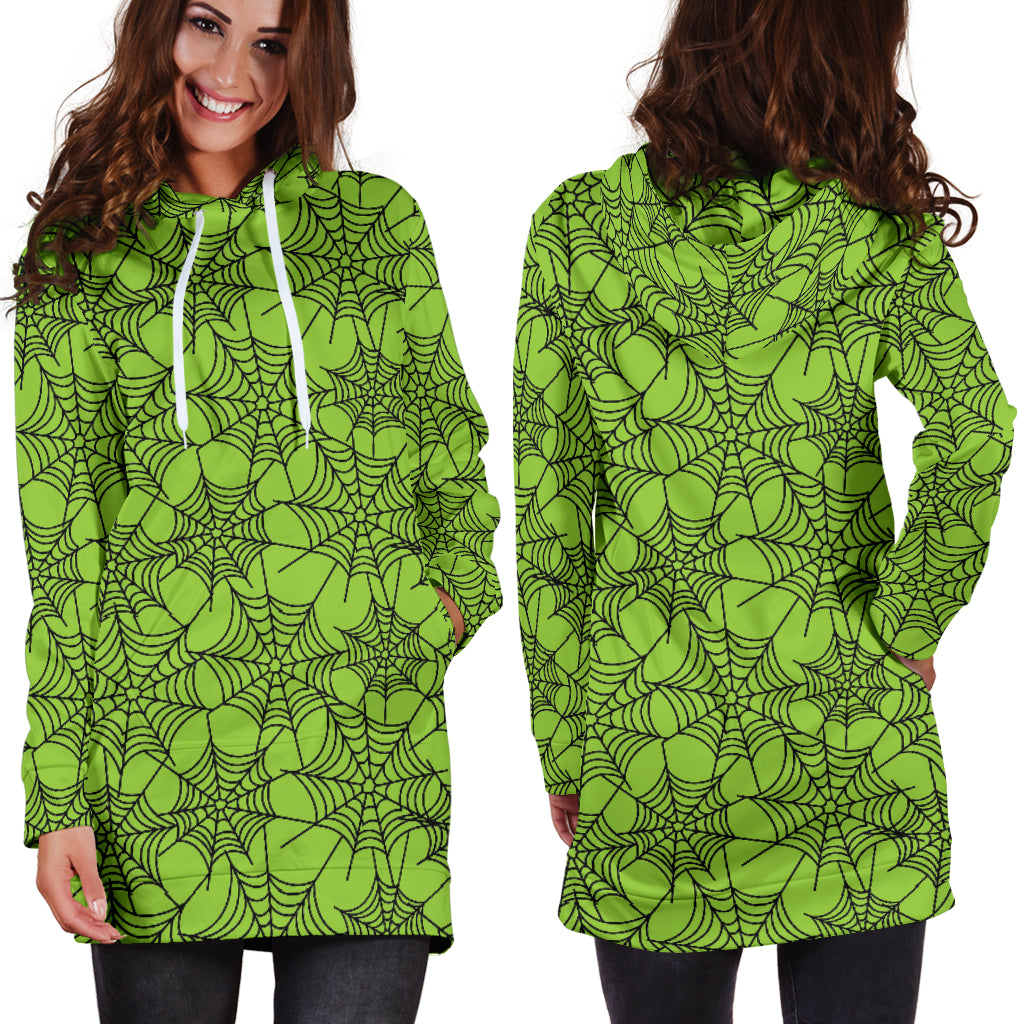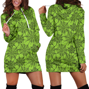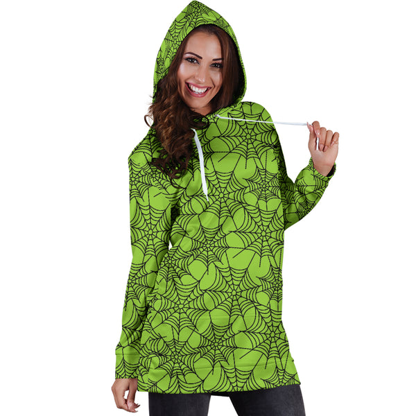 Studio11Couture Women Hoodie Dress Hooded Tunic Green Spider Web Halloween Athleisure Sweatshirt