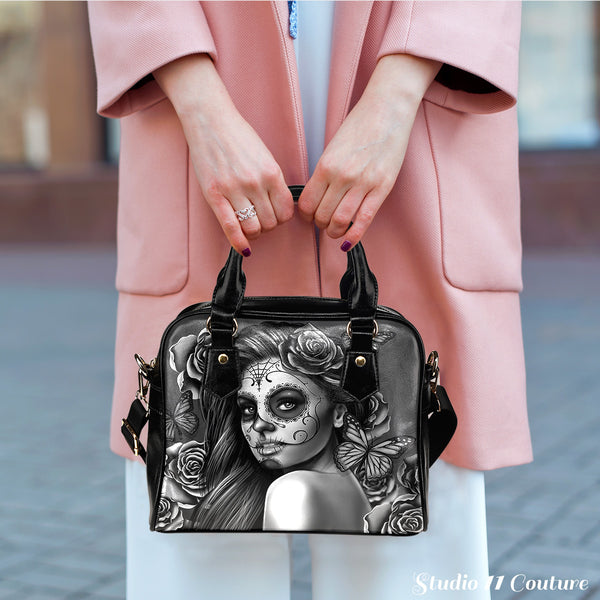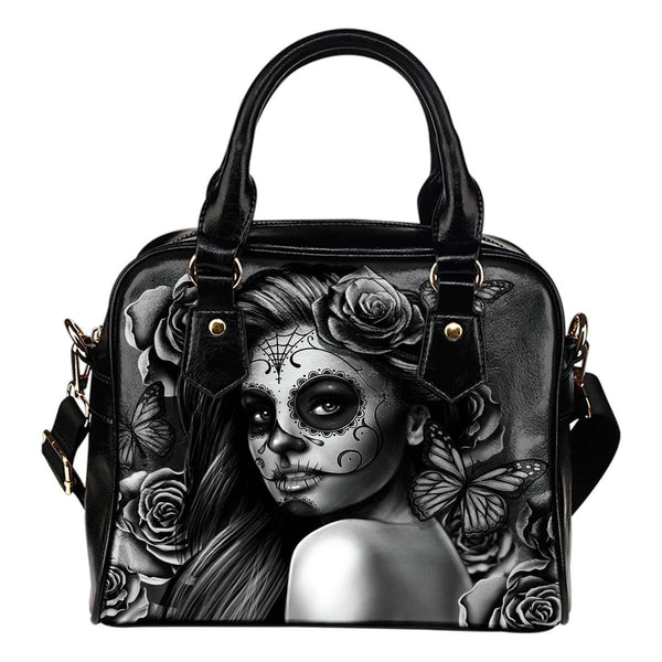 Grey Sugar Skull Girl Theme Women Fashion Shoulder Handbag Black Vegan Faux Leather