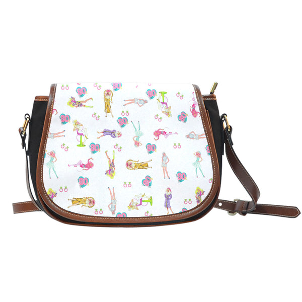 Curved detailing ornates the saddle-shaped flap of a lux crossbody bag crafted from luscious leather and canvas materials. This saddle bag has a flap over the zipper closure. The handbag has an adjustable leather strap with leather detailing. The body is a high-quality canvas material. The prints on the exterior is a contemporary spin on a vintage-inspired leather saddle bag. Great for traveling, date night, and for work. So versatile, you can wear this with any look.