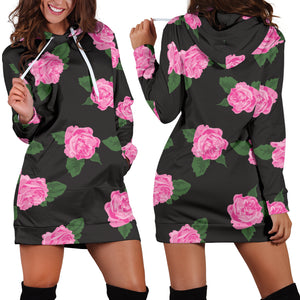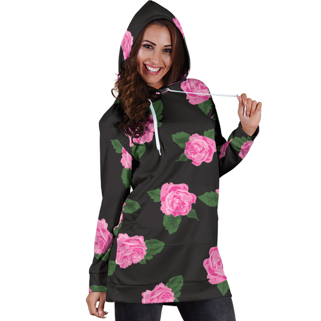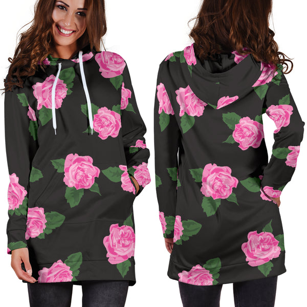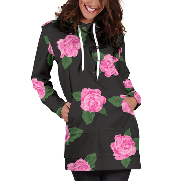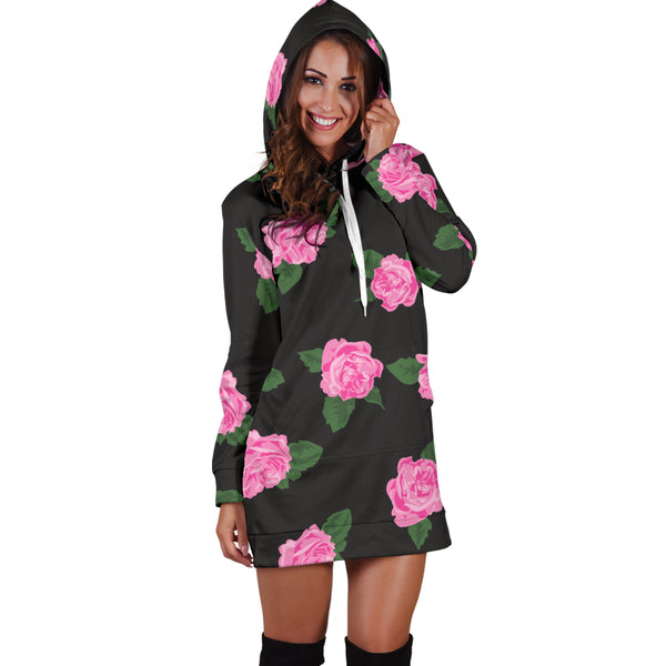 Studio11Couture Women Hoodie Dress Hooded Tunic Large Black Rose Athleisure Sweatshirt