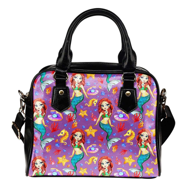 Mermaids Under The Sea Purple Theme Women Fashion Shoulder Handbag Black Vegan Faux Leather
