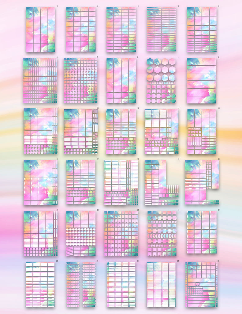 30 unique pages in 3 different formats (JPG, PNG w/ transparent background, and 1 PDF).