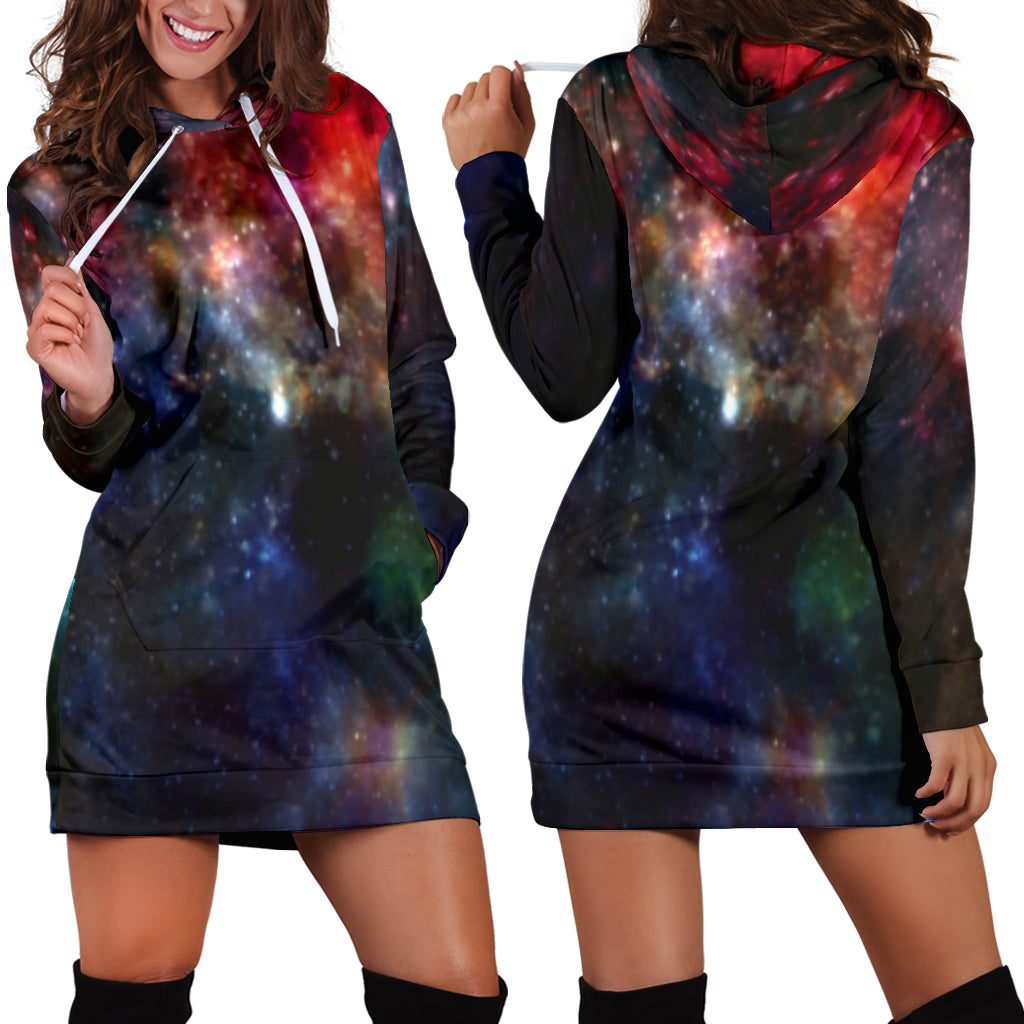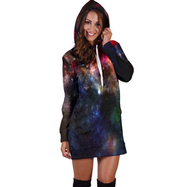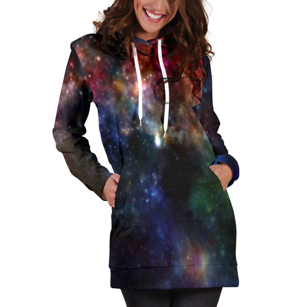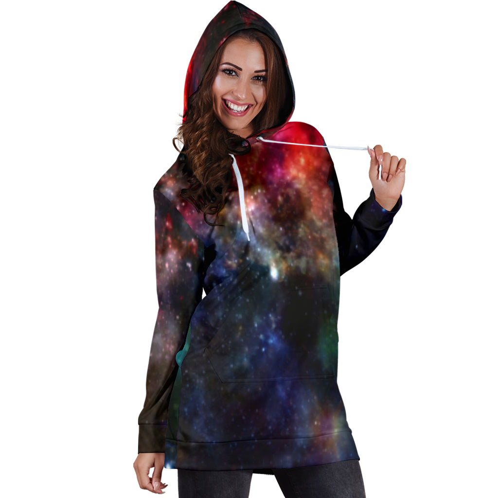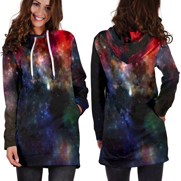 Studio11Couture Women Hoodie Dress Hooded Tunic Red Space Galaxy Athleisure Sweatshirt