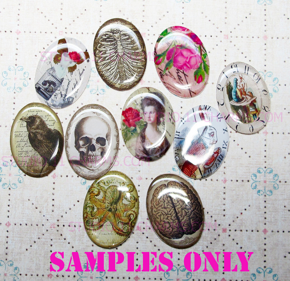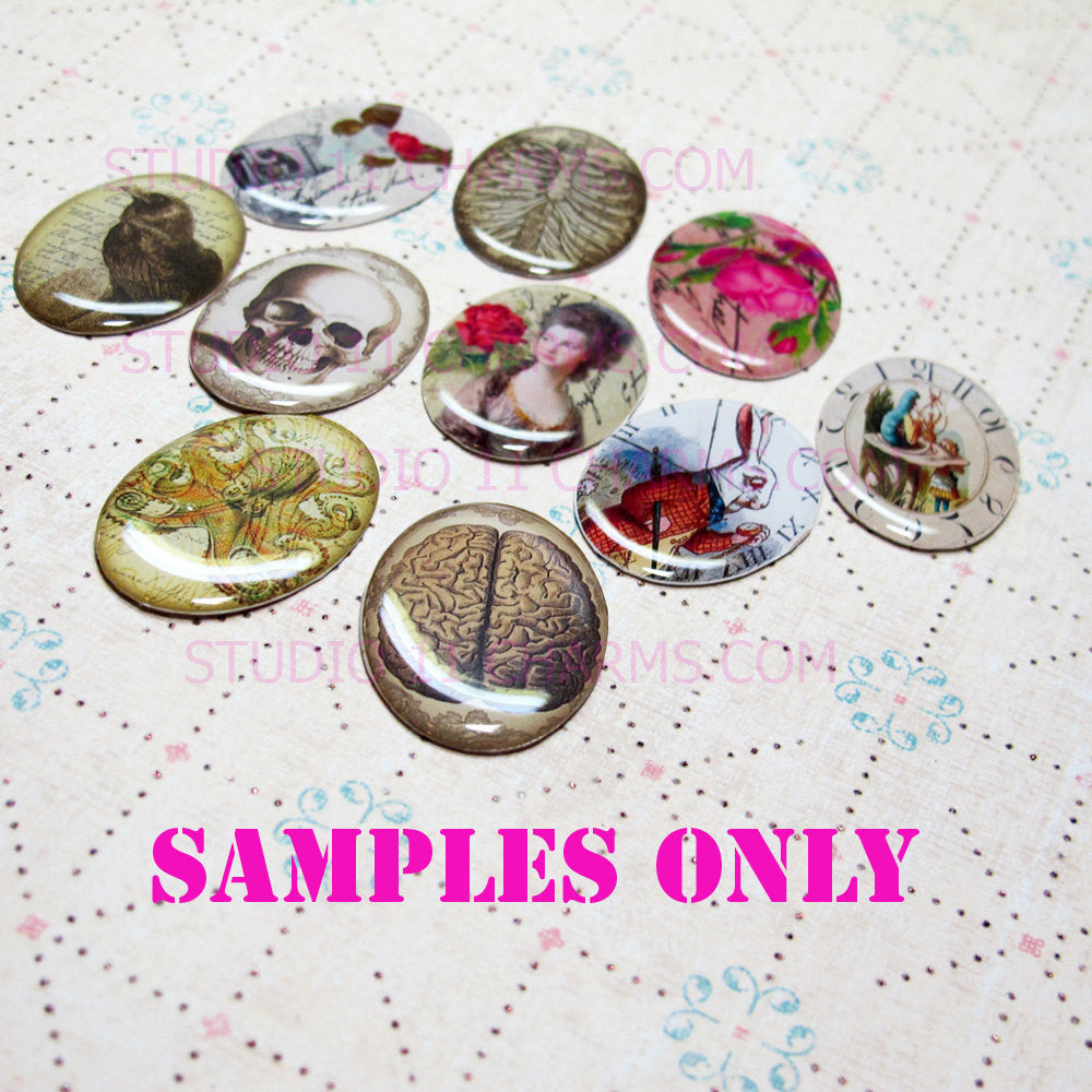 We make a lot of different types of cameos, sizes, and materials. We cannot be responsible if a customer order the wrong product options. If you do not know what these are or how to use these items, please refer to our website and blog for more details, inspirations, and tutorials. Check out our website and blog for clearance items and discount coupons. QUANTITY: The standard lot size is 25 pieces. You will receive pieces with images in the first picture. From image samples #1 to #25 (one of each). WEBSITE OPTIONS ONLY: Smaller and larger lot sizes are available on our main website. Duplicate images are available upon request, but will require longer processing time. MATERIALS: ResinMEASUREMENTS: About 1-2mm thick or 2/23 inch thick. Available in the following sizes (please make your selection in the menu above). 40x30mm oval, 25x18mm oval, 18x13mm oval, 25mm or 1 inch circle. MORE DETAILS: These individually cut and ready to use out of the packaging. All of the cameos are packaged together in wholesale style. If you would like for them to be individually wrapped/packaged, please email us before you check out, there will be an added cost if extra packaging materials are needed and extra time for packing and handling the order. Most of our customers use our cameos to make jewelry and scrapbooking. Of course there are so many different uses for our items. Your imagination is your limit. Check out our website and blog for more ideas on how to use, tutorials, and inspirations. BACKING (ONLY 1 backing option is available per listing). If you want more than 1 type of backing, purchase more than 1 listing. Sorry no mix and match backings on individual listings. This is our effort to cut down confusion and make processing your order faster. NON STICKY BACKING These come standard as non sticky backing. You will need to use glue. E-6000 glue or other craft glue is recommended. It is recommended that you use glue and adhesives that are not too liquidy or runny. Thicker glue and adhesives works better. We have tested our cameos using E-6000 glues and hot glue gun, and they are compatible. And we do not hold responsibility for user errors on other types of glues. STICKY BACKING optional and is available. Works like a sticker. Just peel the backing off the cameos and use like a sticker. It will stick to any clean, flat, dry surface. Works great for most metal and plastic settings and frames. You CANNOT use glue with the sticky back because the glue will damage the backing and image on the cameo. If you want the option to use glue of any kind, this is not the option for you. Choose Non Sticky Backing instead. DO NOT DIP CAMEOS IN LIQUID OF ANY KIND. These are water resistance but they are not made to be submerged into water or liquid. Do NOT swim or shower with these on. Keep in a dry cool place, away from direct sunlight. Made for normal everyday use conditions but NOT made for extreme conditions. SAMPLES ARE AVAILABLE UPON REQUEST. PLEASE SEE WEBSITE FOR MORE DETAILS. CUSTOM ORDERS: Available in a separate listing in my shop and on our website. For more details on custom orders, please refer to our shop listing and website. Or you can email me. All custom orders does take extra time to make. SHIPPING TIME: Depending on the items and order. But requires 5 days to 2 weeks to arrive from time of order. May take longer if customs in your country holds package for inspection. Express and faster shipping available to some destination. Please email me before you place order to discuss your need if you need your package in a rush.