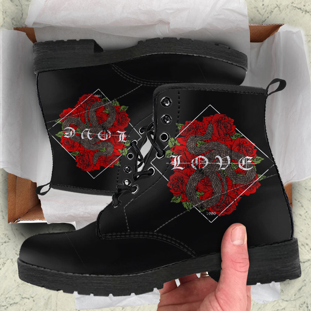 - Features eco-friendly leather with a double-sided print and rounded toe construction.