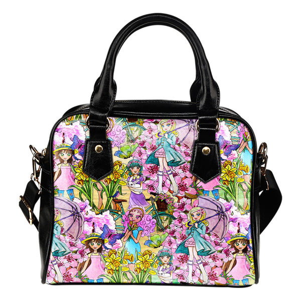 Spring Paper Themed Design B2 Women Fashion Shoulder Handbag Black Vegan Faux Leather