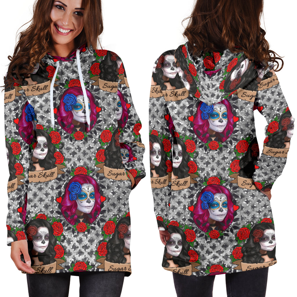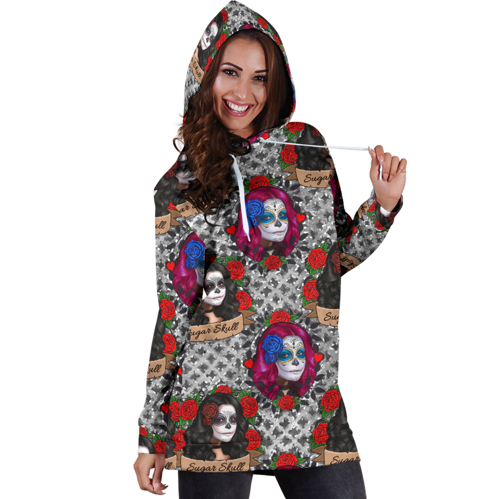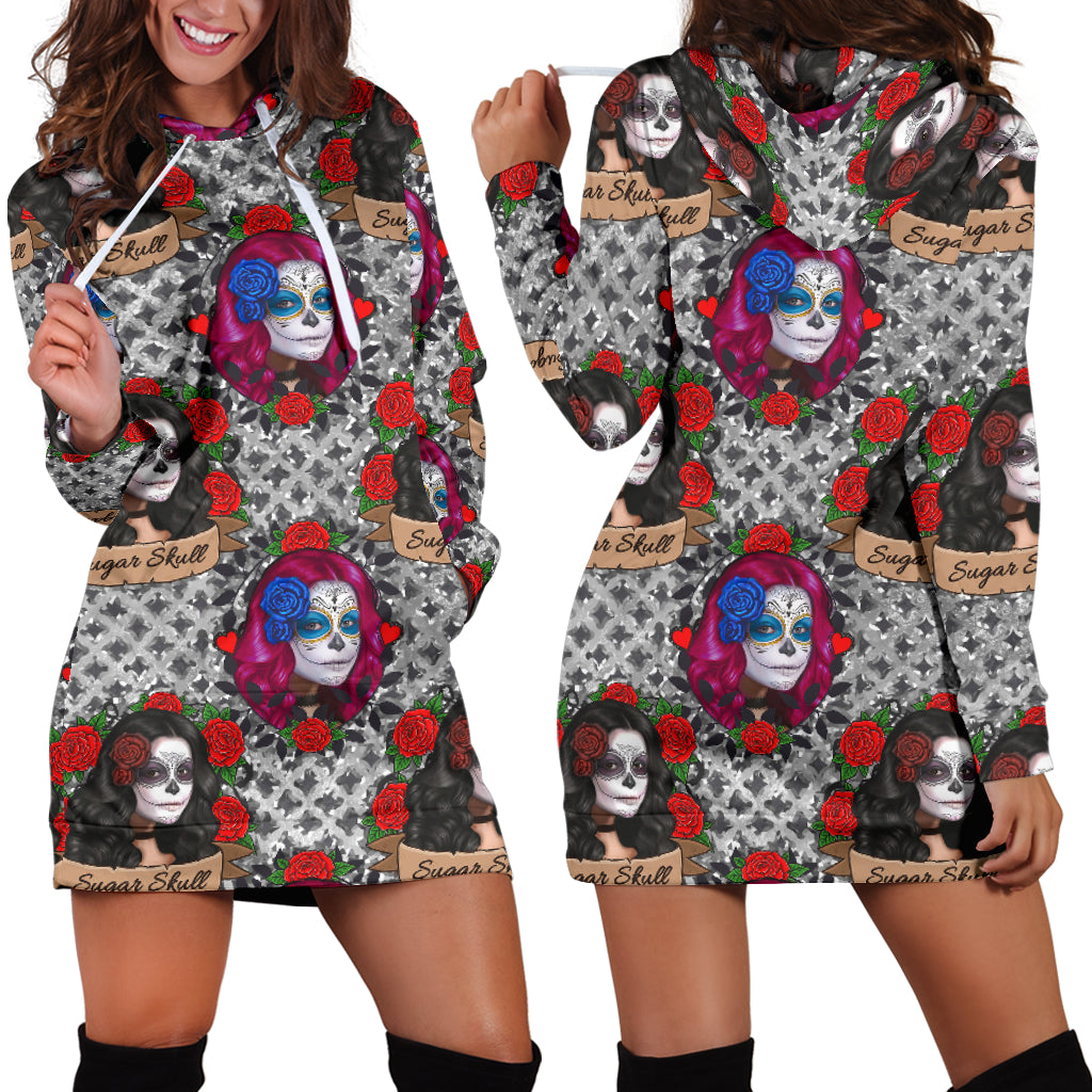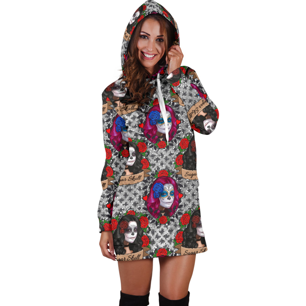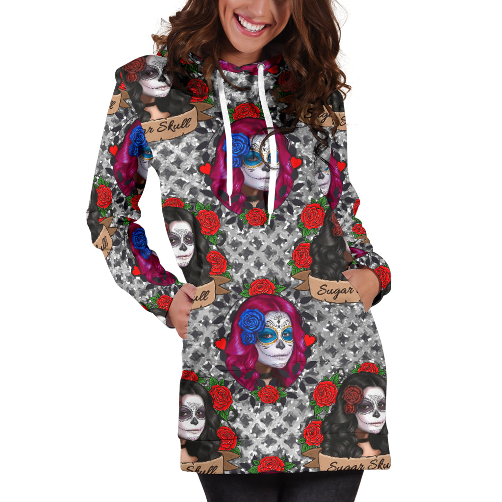 Studio11Couture Women Hoodie Dress Hooded Tunic Sugar Skull Gothic Halloween Athleisure Sweatshirt