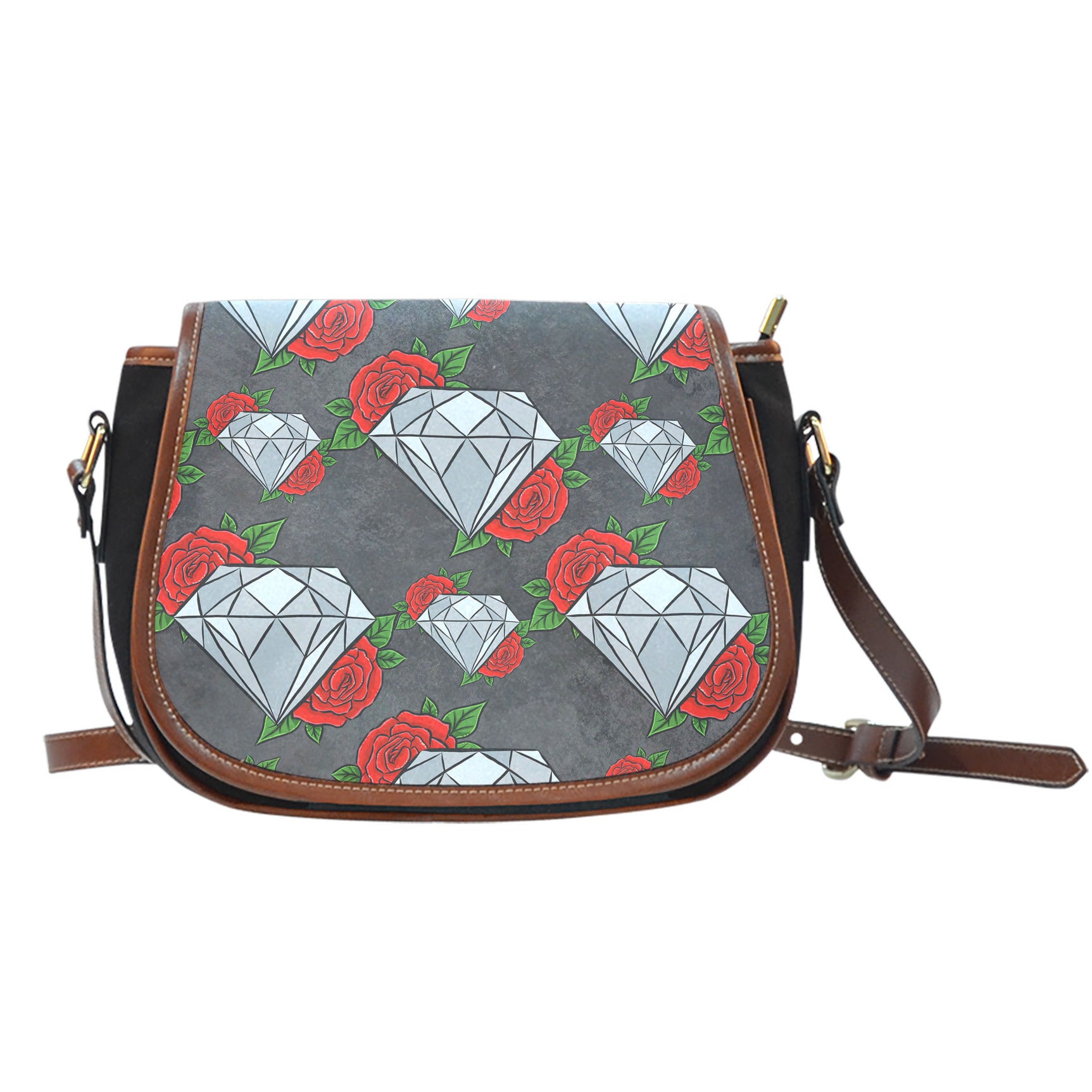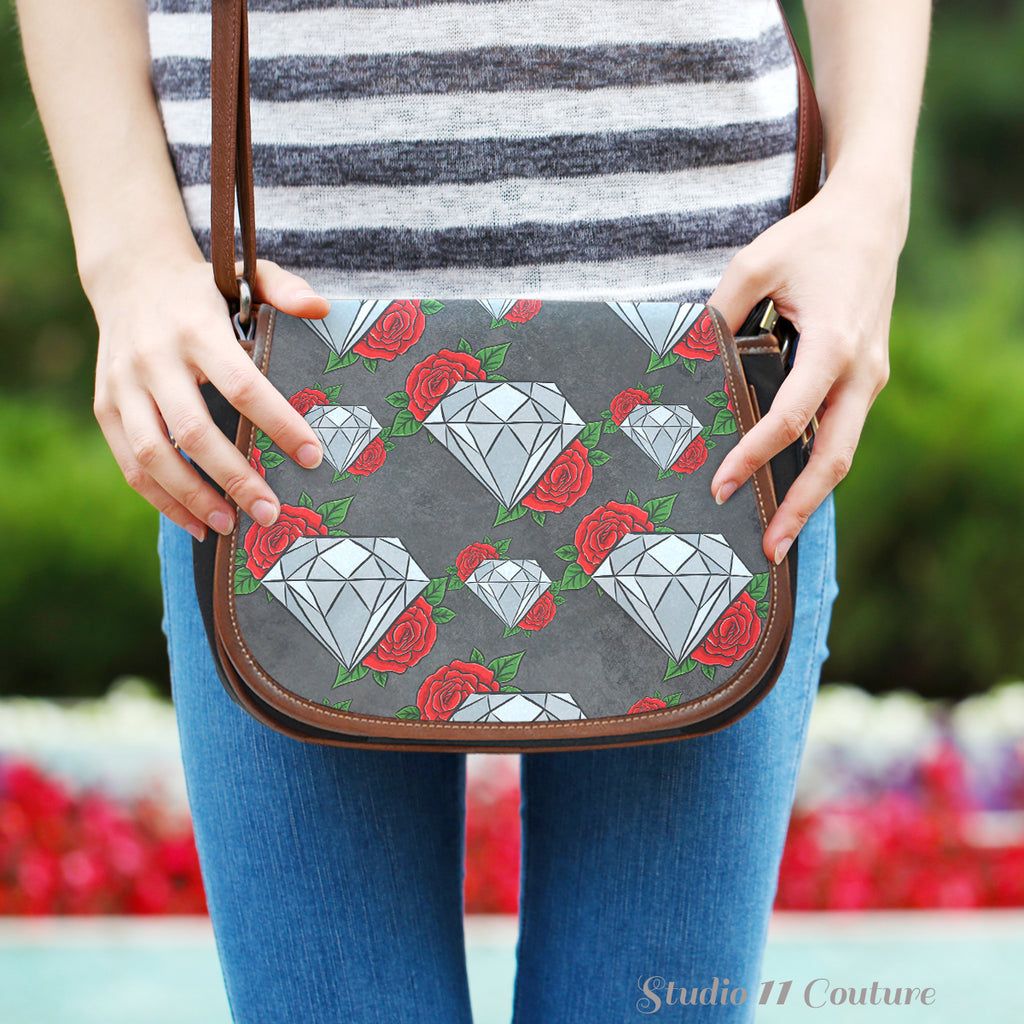 Curved detailing ornates the saddle-shaped flap of a lux crossbody bag crafted from luscious leather and canvas materials. This saddle bag has a flap over the zipper closure. The handbag has an adjustable leather strap with leather detailing. The body is a high-quality canvas material. The prints on the exterior is a contemporary spin on a vintage-inspired leather saddle bag. Great for traveling, date night, and for work. So versatile, you can wear this with any look.
