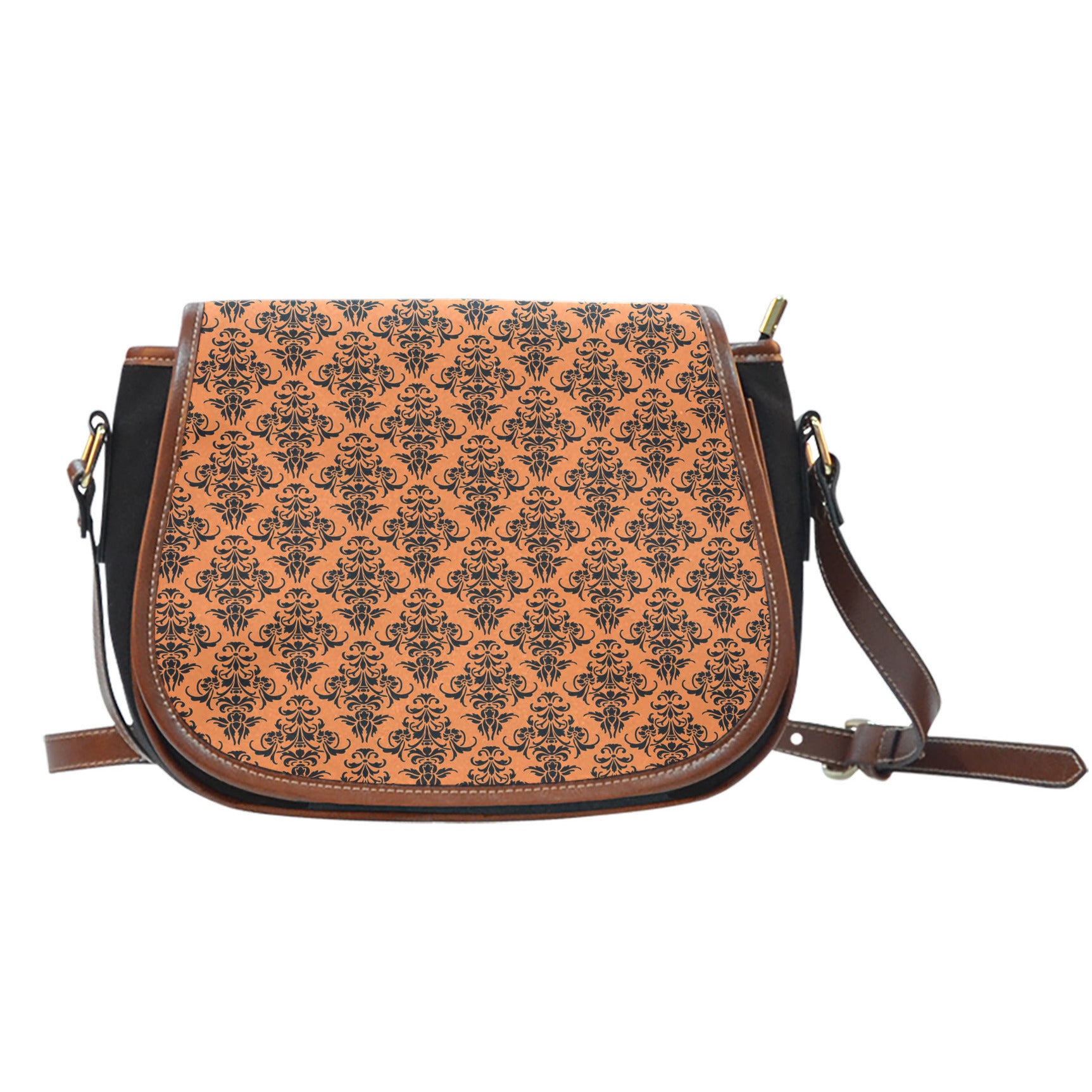 Curved detailing ornates the saddle-shaped flap of a lux crossbody bag crafted from luscious leather and canvas materials. This saddle bag has a flap over the zipper closure. The handbag has an adjustable leather strap with leather detailing. The body is a high-quality canvas material. The prints on the exterior is a contemporary spin on a vintage-inspired leather saddle bag. Great for traveling, date night, and for work. So versatile, you can wear this with any look.