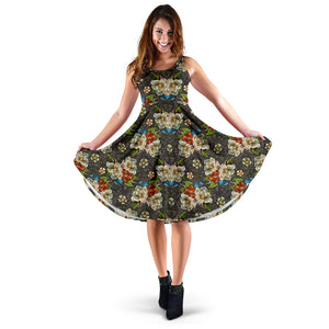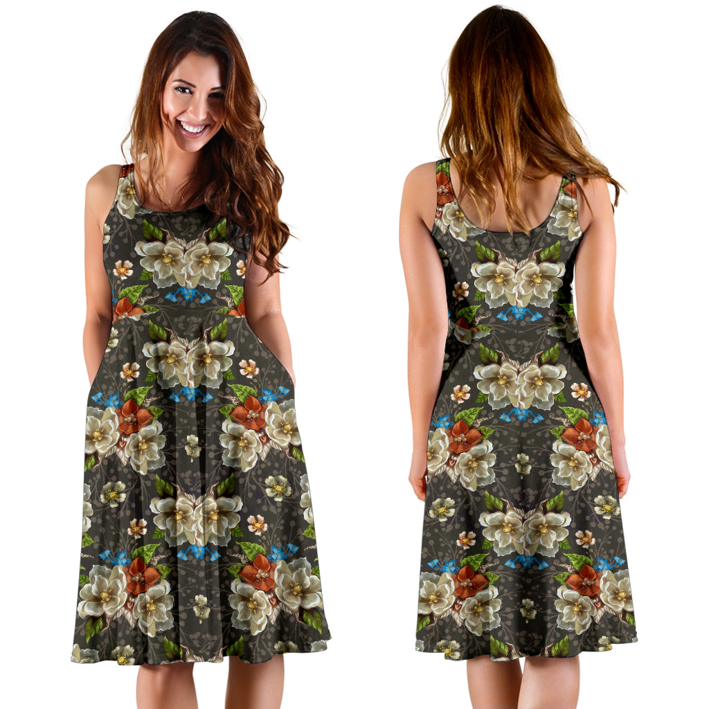 Women's Dress, No Sleeves, Custom Dress, Midi Dress, Gold Floral 1-07