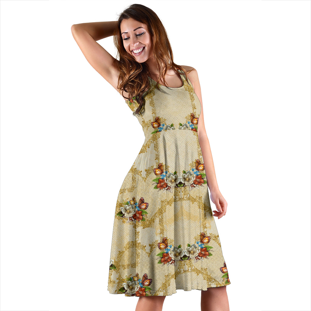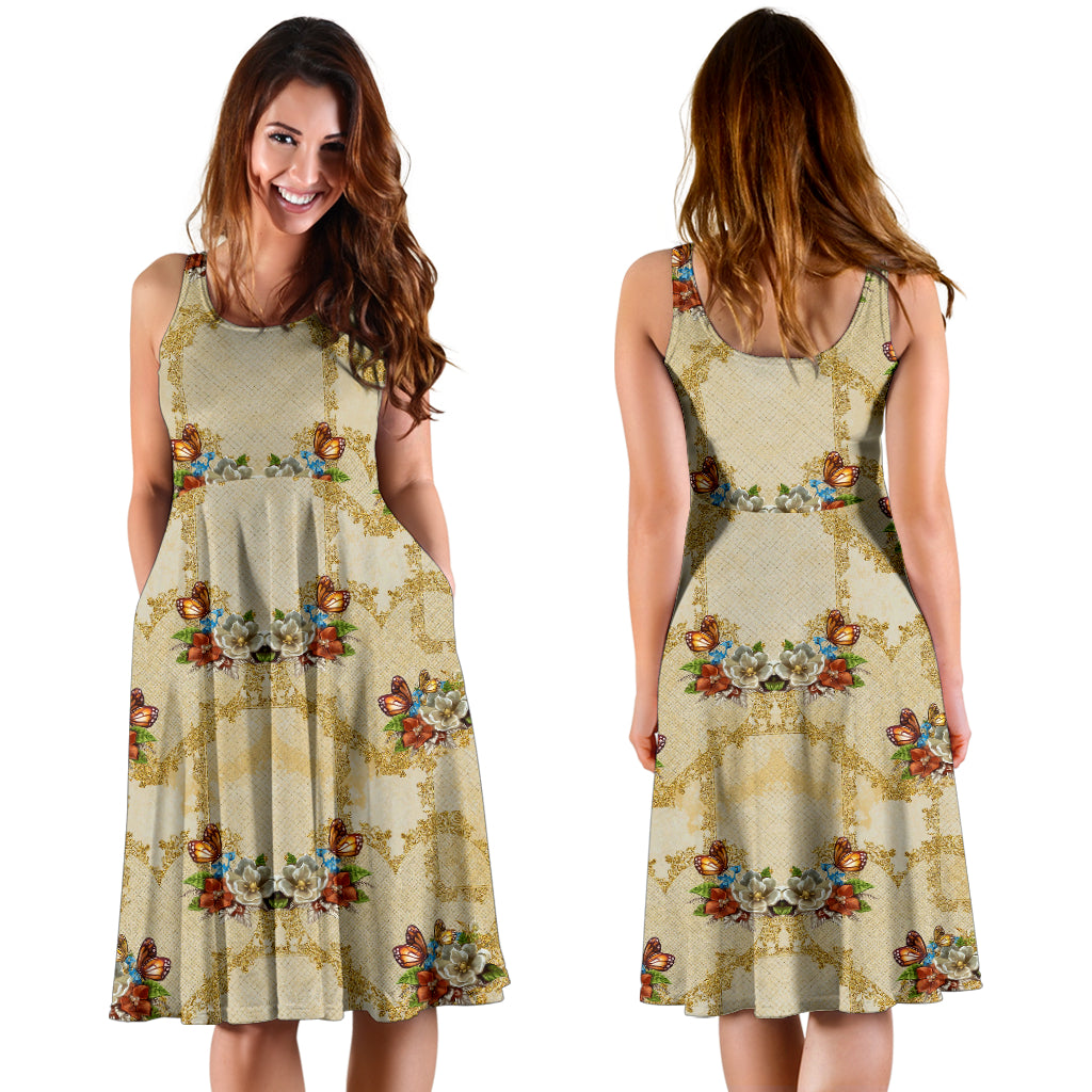 Women's Dress, No Sleeves, Custom Dress, Midi Dress, Gold Floral 1-10