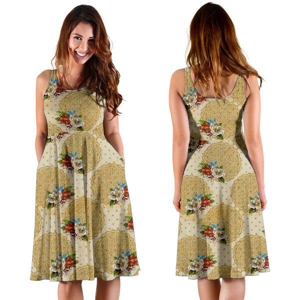Women's Dress, No Sleeves, Custom Dress, Midi Dress, Gold Floral 1-12
