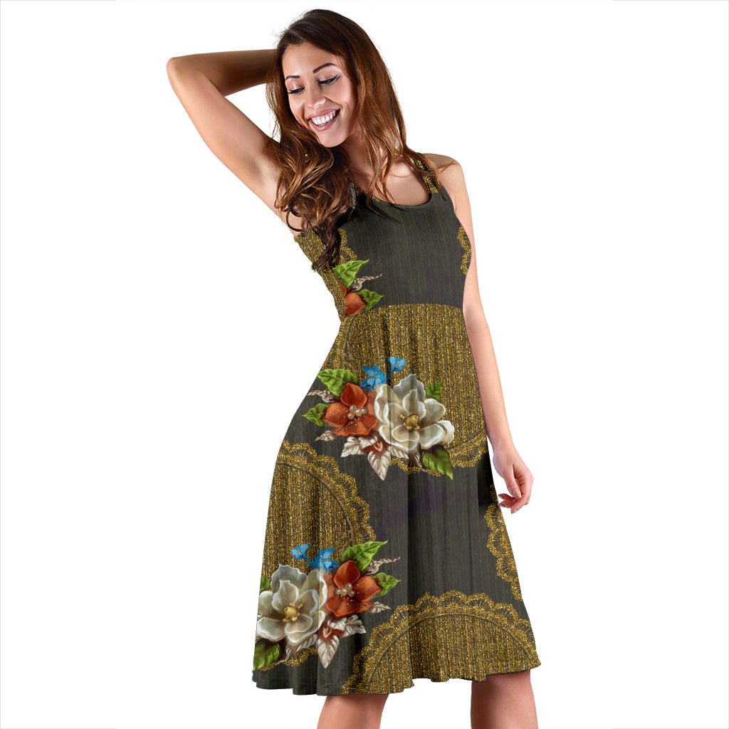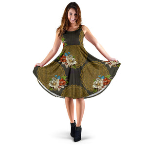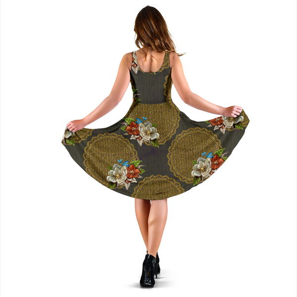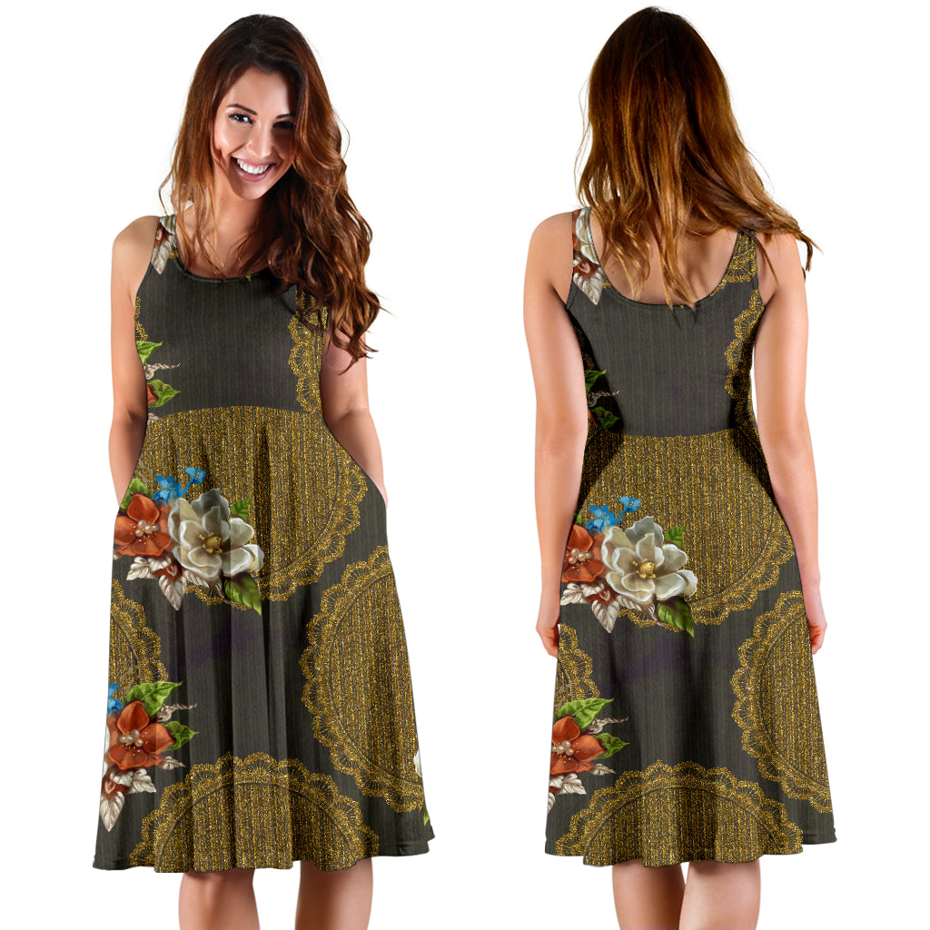 Women's Dress, No Sleeves, Custom Dress, Midi Dress, Gold Floral 1-13